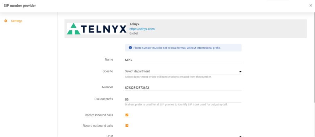 Puntahan lang ang Configurations > Call > Numbers > Telnyx. Ilagay ang VoIP number at gamitin ito agad.