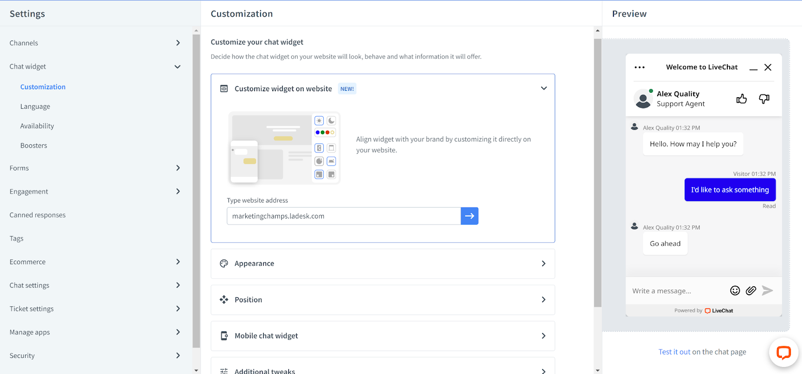 Puwede ninyong i-customize ang inyong chat widget sa LiveChat settings. Ang options ay medyo detalyado kaya kung gusto ninyong maging malikhain, puwede ninyong i-adjust ang live chat widget ayon sa inyong kagustuhan o sa customer branding ninyo. Kabilang sa inyong pagpipilian ay ang magiging hitsura ng inyong window kapag naka-maximize at naka-minimize view, light o dark theme, kulay ng theme (custom color supported), at posisyon ng chat. May option din para itago ang widget, i-customize ang mobile version ng inyong chat widget, at karagdagang tweaks kung saan puwede ninyong ipakita ang logo ng kompanya, i-enable o i-disable ang sounds, hayaan ang chat ratings, at ilan pang mga option.