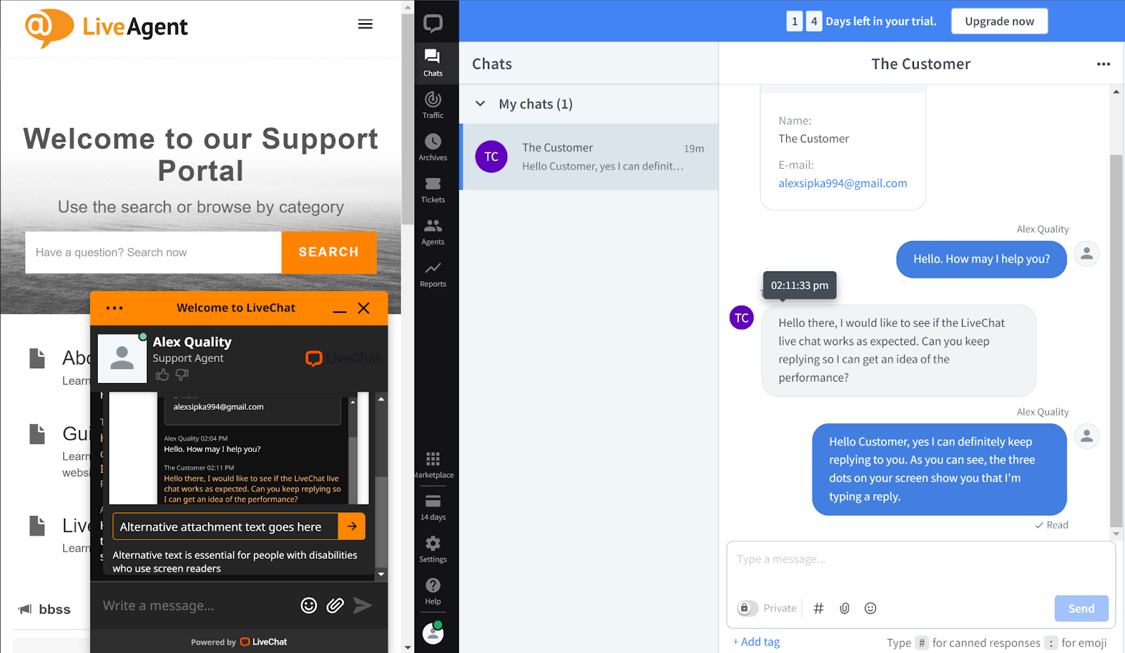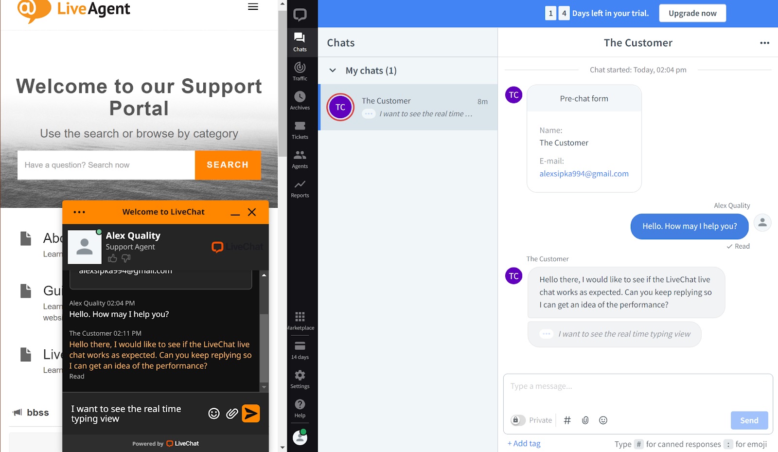 Perpektong gumagana ang message sneak peek at nakuha nito kung ano ang aming sinusulat sa loob ng isang minuto. Ang message ay mananatili sa screen hanggang hindi pini-press ng users ang send button, para maihanda ninyo ang iba pa ninyong messages. Samantala, makakakita ang customer ng tatlong tuldok bilang notification na ang agent ay nagta-type ng tugon sa kanila. Mahusay itong gumagana sa pangkalahatan. Ang bilis ng pagtugon ay halos instant, na hindi na kailagang maghintay nang matagal.