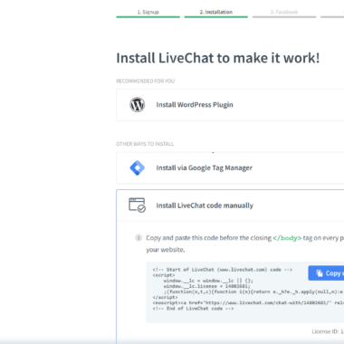 Ang registration ng LiveChat ay napakabilis. Kailangan lang ninyong i-register ang inyong account at dadalhin na kayo ng registration process diretso sa bahagi ng integration ng live chat widget. Ibig sabihin, puwede na ninyong patakbuhin ang inyong live chat sa oras na magsimula kayo. Nakagugulat ang bilis nito at ang LiveChat ay nagbibigay pa ng ilang options sa integration. Puwede kayong pumili sa pagitan ng WordPress plugin, Google Tag Manager, o manual na installation ng live chat code.