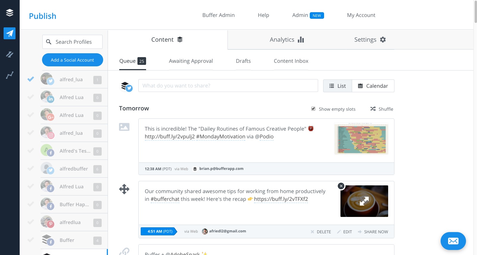 Ang Buffer ay plataporma sa pamamahala ng social media na nangangakong pahuhusayin ang social na pakikipag-ugnayan para sa maliliit na negosyo. Nag-aalok ito ng awtomatikong paglalathala ng paskil, analytics ng kampanya, pagpaplano ng hashtag, pag-iiskedyul ng komento at mga pasadyang ulat.