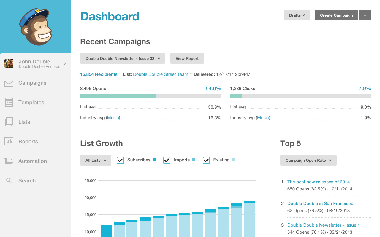 Ang mga gumagamit ng MailChimp ay isinisigaw ang tungkol sa kung gaano kahusay ang mga tampok nito para sa maliliit na negosyo at kung gaano kasimple nitong gamitin. Halimbawa, ang drag at drop na tagabuo ng email nito ay nagpapadali sa pag-format ng magagandang email, at ang malawak na listahan ng integrasyon nito ay pinapadali ang pag-sync ng data sa mga panlabas na CRM at mga katulad nito.